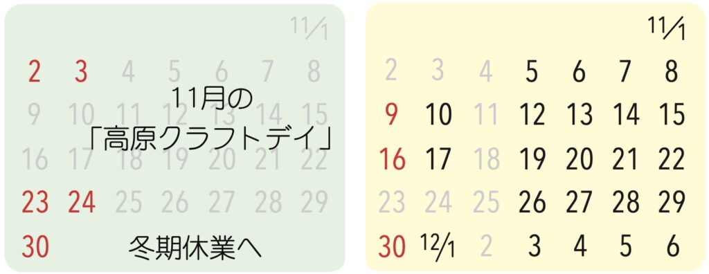 飯田高原店は月に2〜3回ほど「高原クラフトデイ」としてワークショップをメインとして営業いたします。飯田高原店の2025年の営業は11月末までです。
