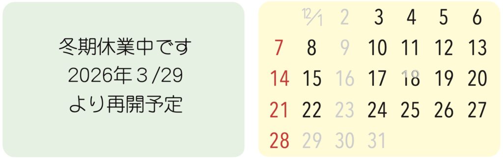 カレンダー スマートフォンでご覧の方はトップのカレンダーページ一番下で「Desktop」「Mobile」を選べます。「Desktop」ではトップ写真下の V をクリックすると各ページの一覧が出ます。画面を横向きにすると見やすい場合があります。「Mobile」では左上の ≡ をクリックすると各ページの一覧が出ます。 営業日カレンダー グレー文字の日はお休みです。11/30は2店とも営業しますが(飯田高原店は15時まで)、ワークショップはお休みします12/1は福岡店リフォームのため休業いたします12/18は所用のため14時より営業します 福岡店は火曜定休(臨時休業あり)で営業しています。飯田高原店営業の際はほぼ閉まります。飯田高原店は月に2〜3回ほど「高原クラフトデイ」としてワークショップをメインとして営業いたします。飯田高原店の2025年の営業は11月末までです。 飯田高原店はワークショップやオーダーメイドのご来店予約がなく、かつ悪天候予報の際はカレンダーで営業予定でも休業する場合があります。公式LINEよりお気軽にお問い合わせ、ご予約ください。 2021年12月31日までのサイトはこちら(更新していません)
