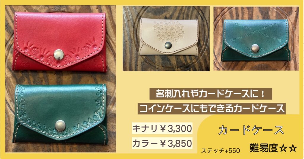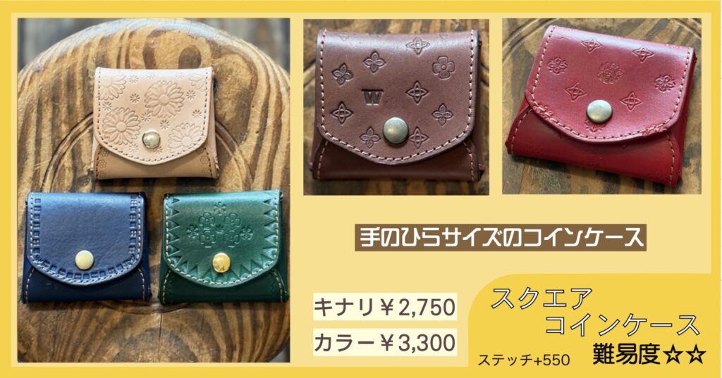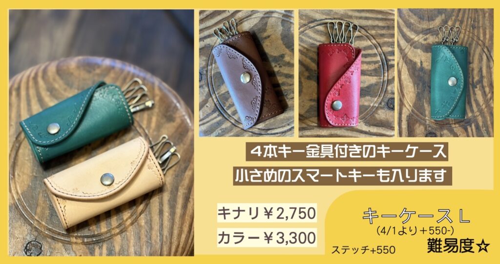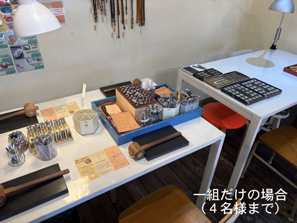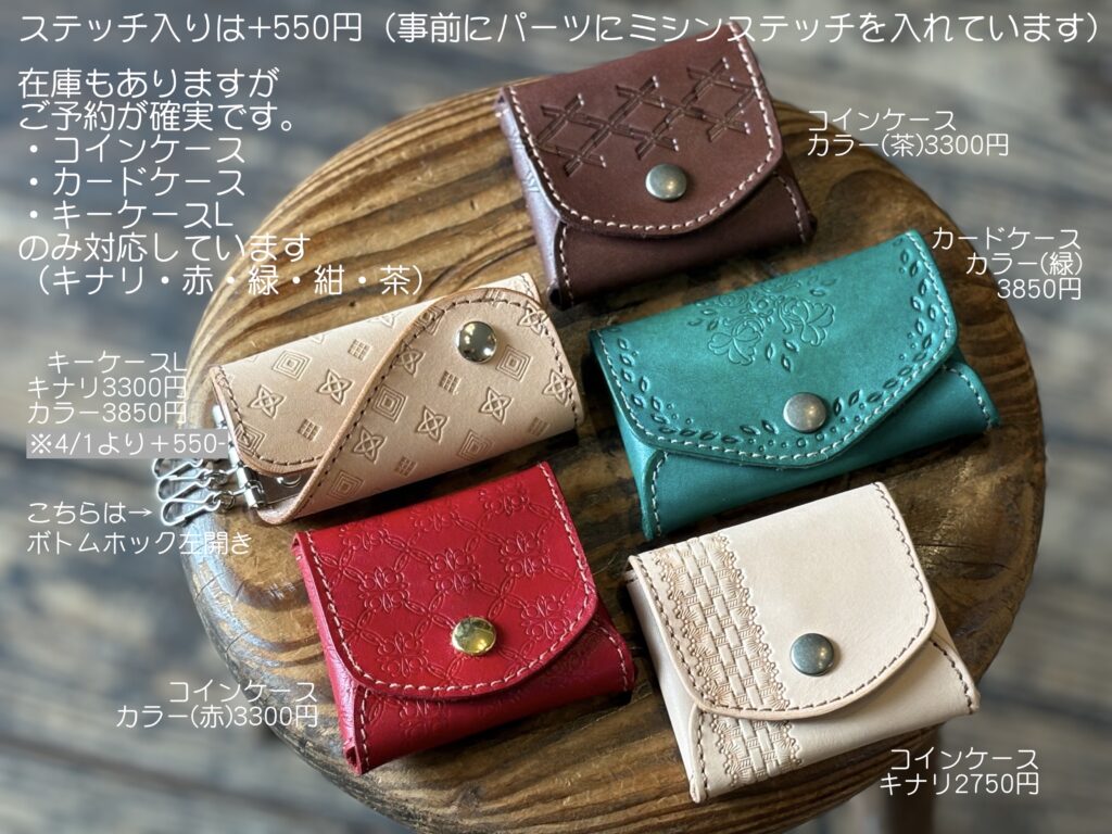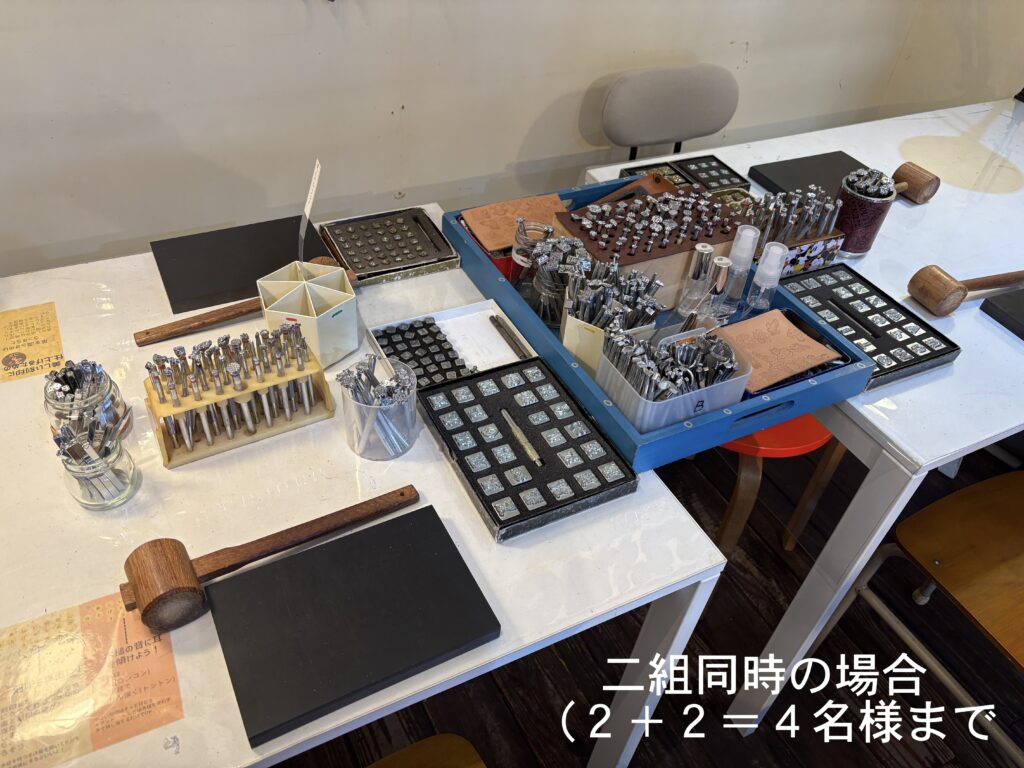 刻印体験ワークショップ 多数のご予約ありがとうございます。当方のお願い通りに①〜④をご記入のうえご予約いただき、とても助かっています。ありがとうございます。 ご予約、お問い合わせの際は、「店名、日時、お名前、人数」を必ずお書きください!①〜④を必ずご記入ください。 ⇧公式LINEからのご予約が助かります⇧(個人LINEではありませんので夜間、定休日などは翌日返信します)『刻印体験A』は当日の店内でアイテムを決められますので枠だけ予約できます。事前指定していただくと確実です(アイテム・カラー・ステッチ有無まで)。事前指定していても当日パーツがあるものには変更可です。電話予約は受けておりません。 福岡店 11時〜 13時〜 15時〜 週末のみ17時〜(土・日・祝と時々金曜)1テーブル4名様まで飯田高原店 10時〜 12時〜 14時〜1テーブル6名様まで※リクエスト予約です。第二希望まで書いてあると第一希望が取れなかった時にすぐに押さえられます。何時でもいいです!は困ります。 ✴︎ 福岡店:二組目の予約を承ることにしました ✴︎ LINEでのご予約は開始24時間前までにお願いいたします。営業終了後〜深夜に翌日のご予約をいただいても確認、返信できません。 ✴︎ 福岡店:以下の時間帯は「刻印体験」の予約がいっぱいです ✴︎ 下記にない時間帯は最高4名様まで承れます できるだけリアルタイムで更新していますが 更新が間に合わない場合があります(2/16/9:32更新) 2/16(月)13時のみ2名様可 2/18(水)全枠満席 2/19(木)13時 15時は終了 2/20(金)13時 15時は終了 2/21(土)全枠満席 2/22(日)全枠満席 2/23(月・祝)全枠満席 2/25(水)13時 15時は終了 2/26(木)11時 15時は終了 2/27(金)15時は終了 2/28(土)全枠満席 3/1(日)11時は終了 3/2(月)13時は終了 3/4(水)15時のみ4名様可 3/5(木)13時 15時は終了 3/7(土)〜3/8(日)休業 3/11(水)11時は終了 3/14(土)11時 13時は終了 3/15(日)13時 15時は終了 3/21(土)11時は終了 3/23(月)15時は終了 4/3(金)11時は終了 飯田高原店は月に1〜2回「高原クラフトデイ」として日〜月曜や連休中心で営業いたします。 グレイ文字の日はお休みです。3/7〜8はイベント出店で店は休業です。福岡店にはトイレありません。 ご予約は最長3ヶ月先までです 先日までひとつの枠に一組限定でゆっくり刻印体験していただいていたのですが、手狭にならないように、2+2名様まで同時に受け付けられるようにレイアウトを変更いたしました。共有の刻印がありますが譲り合いながら使用していただけたらと思います。3+1、3+2などは承りません。3〜4名様グループのご予約があれば一組で受付終了です。お友達グループ6名くらいでもできますが、少々やりにくくなります。刻印体験されたお客様にアンケートしたところ「相席でもいいから体験したい」というご意見が大多数だったので、できるだけ息苦しくないようにスペースも刻印使用についても配慮したいと思います。これまでお断りした皆様申し訳ありません。1グループで6名様までは、他の予約が入っていない枠のみ承れることがあります。 製作アイテムについて キーホルダー、トレイ、ミニキーケース類は当日お選びください。キナリはいつもありますが、事前に指定していただいた場合、カラーを増やしておきます。アイテム、カラー指定はご来店時にご希望のものがないことを防ぐためのシステムです。ですので当日、他のものと変更することは問題ありません。指定はおひとり1点までで、アイテム、カラー、ステッチ有無(コインケース、カードケース、キーケースL)まで決めていただく必要があります。 オーダーメイド革工房として25年間やってきたので、ワークショップの素材もできるだけお好みの形にしたいと思ううちに、選択肢が増えてしまいました。当日全パターンを準備できるわけではありませんので、事前に指定していただけると助かります。 コインケース、カードケース、キーケースLのみあらかじめミシンステッチを入れたパーツを準備しています。ステッチはそれぞれ+550-です。その場で選べるものもありますが、ご希望のアイテムとカラーを指定していただければ準備しておけます。この3アイテムのカラー指定は「ステッチ有無」まで含みます。キーケースLの形の基本は下記写真「ボトムホック・左開き」です(下の写真のものは「ボトムホック・左開き・キナリ・ステッチあり」)。「ボトムホック・右開き」「センターホック」もあります。※これまでの金具色にゴールドが加わります(在庫は変動します)。また同時にキーケースLの金具値上がりのため、4月1日以降、3300円〜に値上げいたします。3月末まで、および2/11までに4月以降分をご予約の方は価格据え置きです。新価格:キナリ 3300- カラー 3850- それぞれステッチ+550-例:コインケース、カードケース、キーケース指定のみ → キナリ(ステッチなし)を準備します。当日他の色から選ぶこともできます。アイテム指定1:コインケース カードケース キーケースL(ボトムホック左開き・ボトムホック右開き・セ