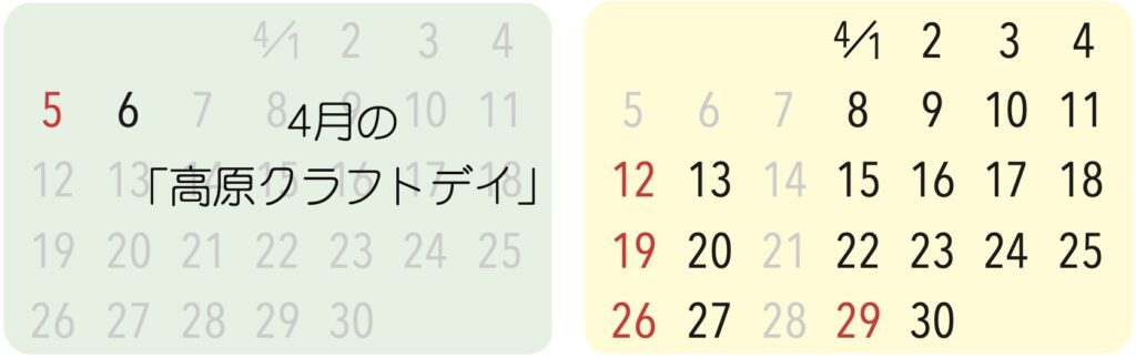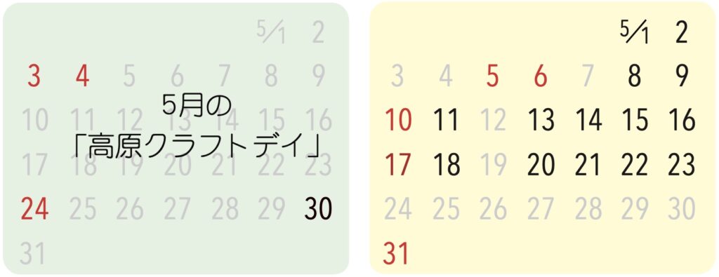 飯田高原店は月に2〜3回ほど「高原クラフトデイ」としてワークショップをメインとして営業いたします。飯田高原店は水回りトラブルのため当面、営業日が限られます。
