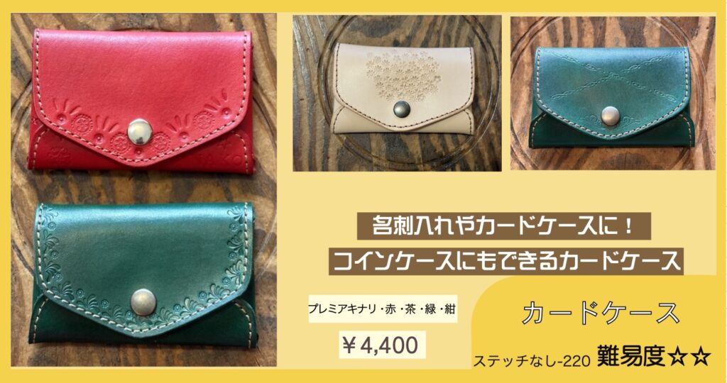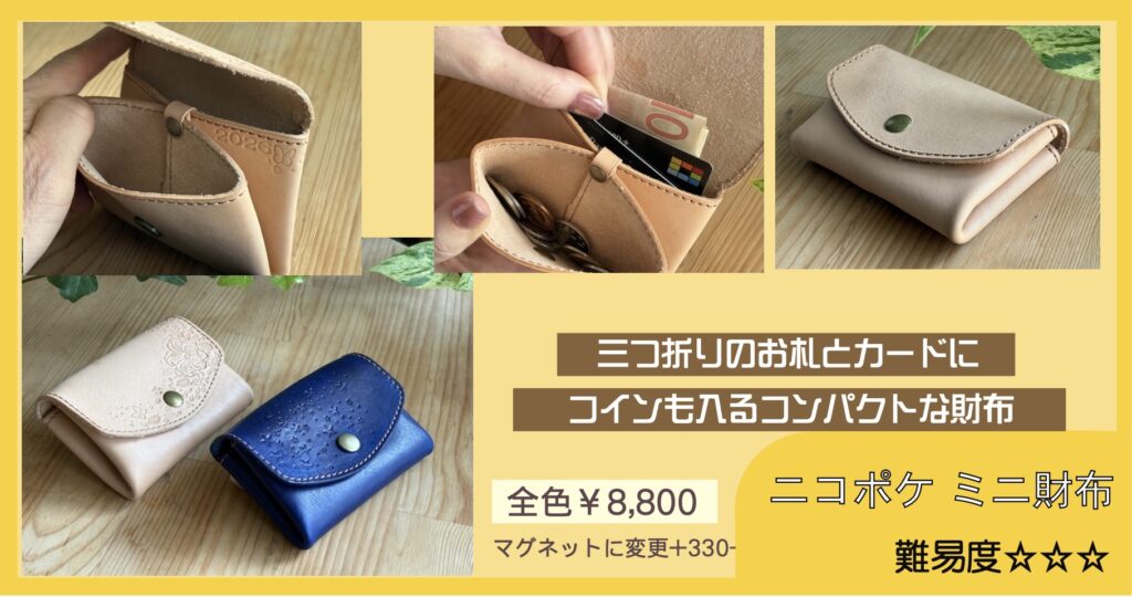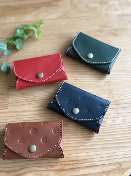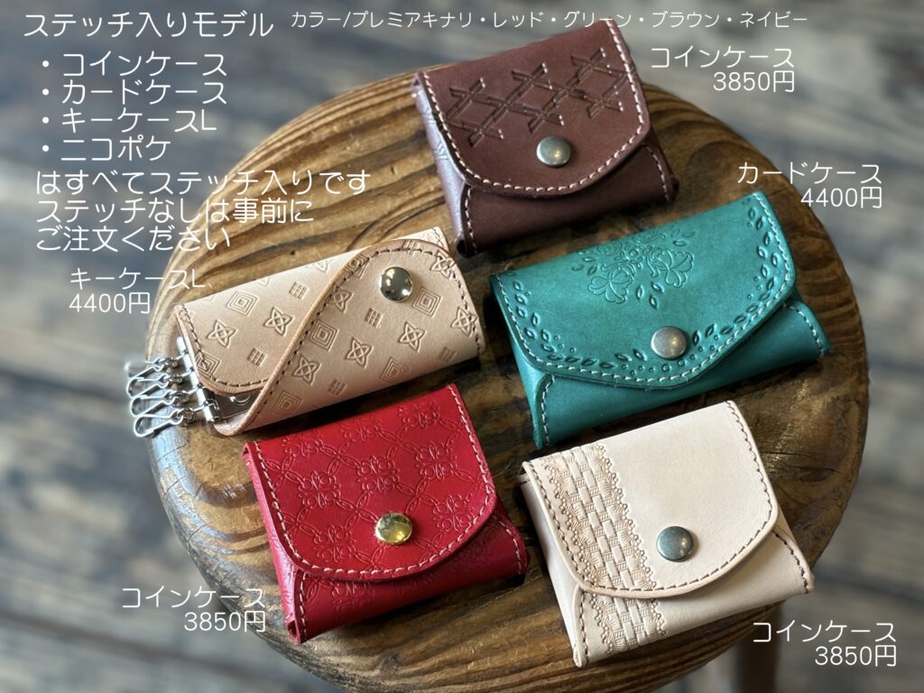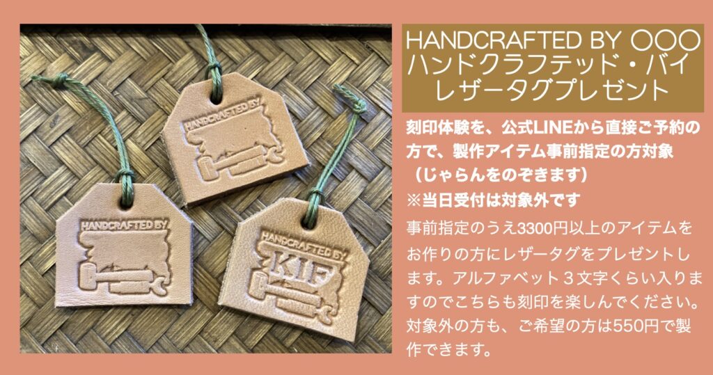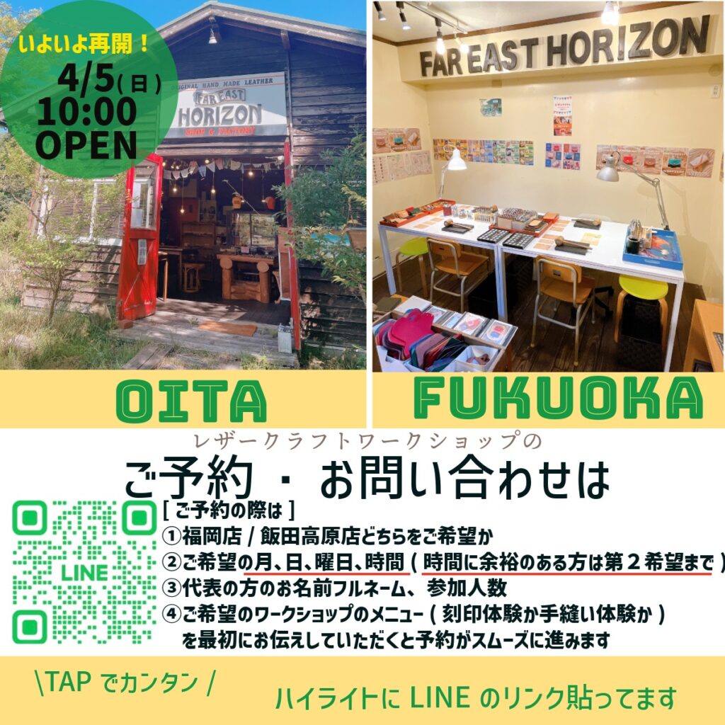 刻印体験ワークショップ 多数のご予約ありがとうございます。当方のお願い通りに①〜④をご記入のうえご予約いただき、とても助かっています。ありがとうございます。 ご予約、お問い合わせの際は、「店名、月・日・曜日・時間、お名前、人数」を必ずお書きください!①〜④を必ずご記入ください。 〜キャンセル待ちについて〜この日の満席は知ってるけど、空いたらなんとかなりませんか?というお問い合わせがとても増えています。この返信にかなり手をとられています。申し訳ありませんが、キャンセル待ちは受けておりません。キャンセルが出た場合、下記の予約状況を更新しますので、そちらをご覧のうえお申し込みください。先着順になります。 〜アイテム指定について〜アイテム指定されていない場合、ご希望のカラーがない可能性があります。特に最近、コインケース、カードケースのブラウンとネイビーに人気が集中する日があり、突然在庫が無くなることがあります。頑張ってきましたが、毎日毎時間、各アイテム各色を揃えることが難しくなってきました。パーツを切って、染めて、乾燥、磨いて、ステッチを入れて、の工程を毎日のワークショップ終了後から十数枚行なうのですが、製作できる数に限りがあり、毎日残りパーツを見ながら揃えています。しかし、同時に同じアイテムの同色が三枚出たりするともう次の時間帯には間に合いません。冷や汗をかきながらワークショップの横で必死で作っています。出来るだけ事前アイテム&カラー指定していただけると確実です。 ⇧公式LINEからのご予約のみです⇧(個人LINEではありませんので夜間、定休日などは翌日9時以降に返信します)※予約確定をお送りしたあと、一定期間「既読」がつかない場合、連絡不能なアカウントとして予約を取り消しさせていただくことがあります。ご理解ください。『刻印体験A』は当日の店内でアイテムを決められますので枠だけ予約できます。事前指定していただくと確実です(アイテム・カラーまで)。事前指定していても当日パーツ在庫があるものには変更可です。電話、DM、Eメールでの予約は受けておりません。 福岡店 11時〜 13時〜 15時〜 週末のみ17時〜(金・土・日・祝)2テーブルで4名様まで トイレありません飯田高原店 10時〜 12時〜 14時〜1テーブル6名様まで(2グループ)※リクエスト予約です。第二希望まで書いてあると第一希望が取れなかった時にすぐに押さえられます。複数指定ではなく、優先順位を決めてくださいね。何時でもいいです!は困ります。 ご来店の際は「ワークショップ予約した⚪︎⚪︎です」と声をかけていただけると助かります。過去に「ワークショップの方ですか?」「違います」を何度もやって恥ずかしい思いをしているのでお願いします。 New!!三つ折りのお札、カード、コインを収納できるポケット2つの「ニコポケ」登場しました。詳しくは下の「製作アイテムについて」にて 17✴︎ 福岡店:二組まで予約を承ります✴︎ ✴︎ 飯田高原店:4月5日(日)スタートします。二組まで予約を承ります✴︎ LINEでのご予約は開始24時間前までにお願いいたします。営業終了後〜深夜に翌日のご予約をいただいても確認、返信できません。 ✴︎ 福岡店:以下の時間帯は「刻印体験」の予約がいっぱいです ✴︎ 下記にない時間帯は最高4名様まで承れます できるだけリアルタイムで更新していますが 更新が間に合わない場合があります(4/4/18:09更新) 4/4(土)全枠満席 4/5(日)飯田高原店にて営業 4/6(月)飯田高原店にて営業 4/9(木)11時は終了 4/11(土)全枠満席 4/12(日)全枠満席 4/16(木)15時は終了 4/18(土)全枠満席 4/25(土)13時、17時は終了 4/26(日)13時は終了 5/5(火)15時は終了 5/10(日)15時は終了 5/23(土)15時は終了 ✴︎ 飯田高原店:以下の時間帯は「刻印体験」の予約がいっぱいです ✴︎ 5/4(月)14時は終了 飯田高原店は月に1〜2回「高原クラフトデイ」として日〜月曜や連休中心で営業いたします。 グレイ文字の日はお休みです。福岡店にはトイレありません。 ご予約は最長2ヶ月先までです 福岡店では2+2名様まで同時にワークショップできます。共有の刻印がありますが譲り合いながら使用していただけたらと思います。3+1、3+2などは承りません。3〜4名様グループのご予約があれば一組で受付終了です。お友達グループ6名くらいでもできますが、少々やりにくくなります。 1グループで7名様までは、他の予約が入っていない枠のみ承れることがありますが、まあまあ狭く、うるさくなります。 九州まで遠くてワークショップには来られないけど、このデザインは欲しい、という方のために一部商品を発売いたしました。まずはカードケースから。革質はワークショップと異なるマットレザーを使用しています。デザイン込みのセミオーダーです。 通販ページへ 製作アイテムについて 事前に「キーケースL 赤 ボトムホック 右開き ステッチあり」など指定していただいていると、当日、不安なく選んでいただけます。そ